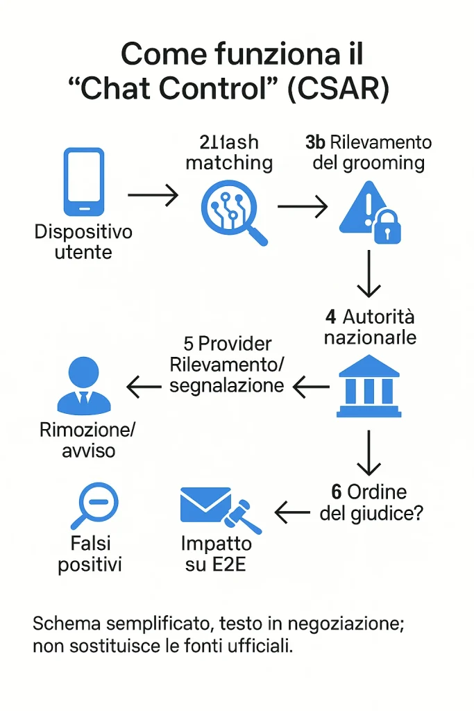 Nel 2023 il Parlamento europeo, pur riconoscendo la necessità di contrastare gli abusi online sui minori, ha stabilito che ogni forma di controllo dei contenuti delle comunicazioni possa avvenire solo su disposizione dell’autorità giudiziaria e che non sia in alcun modo compromessa la crittografia end-to-end.